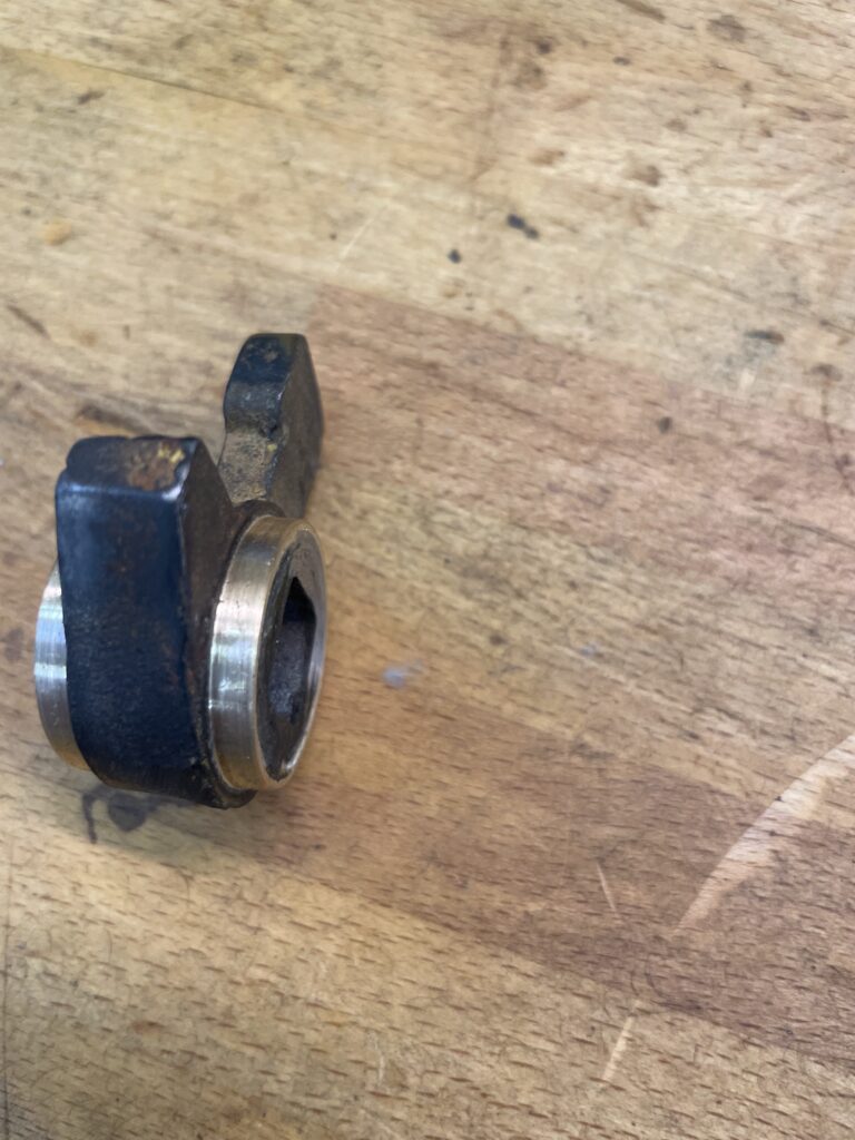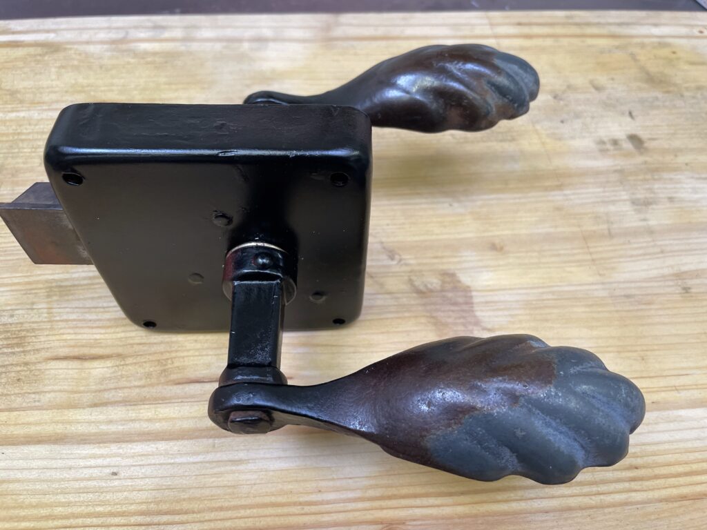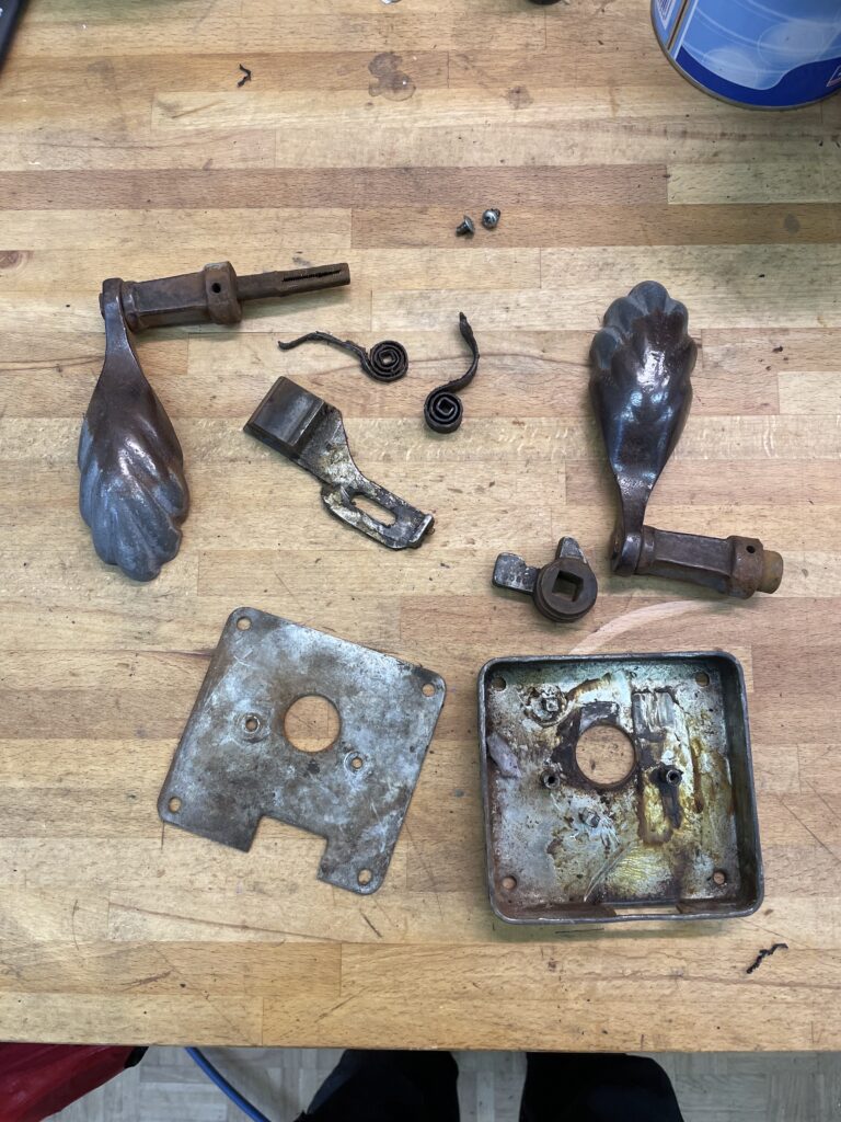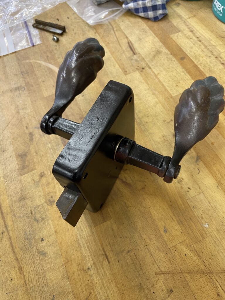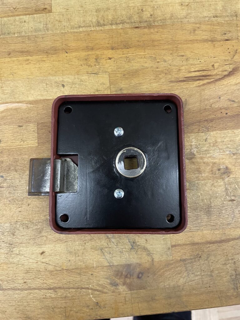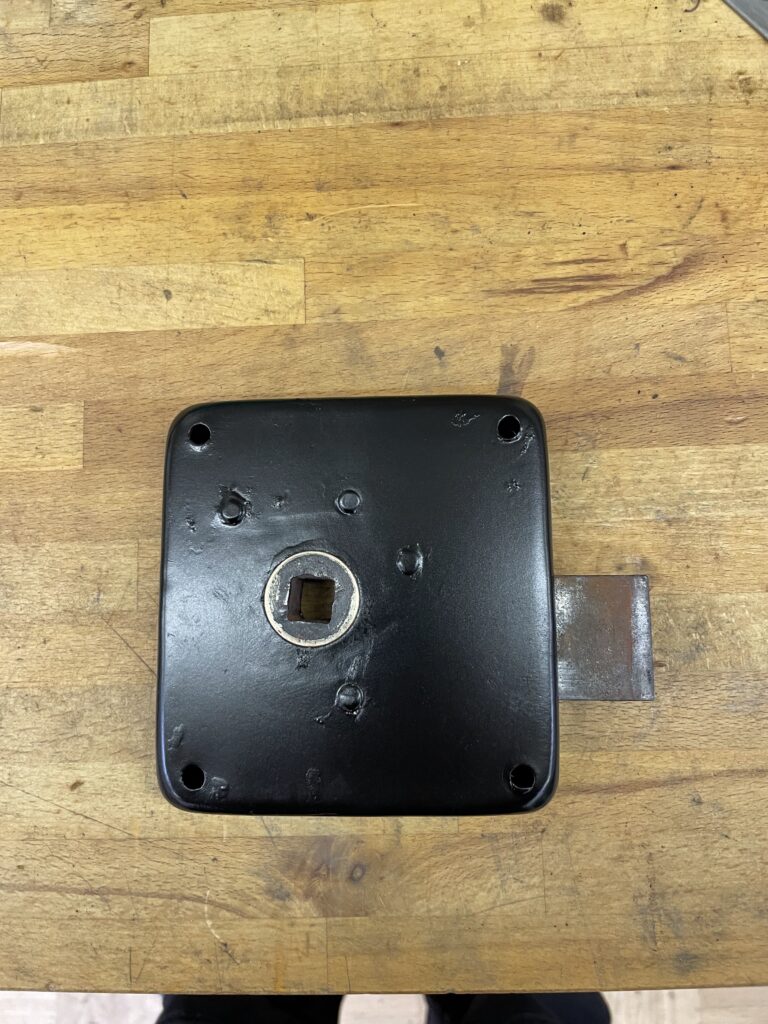 Türdrücker hing durch, Schloss und Drücker ausgeleiert, Schlosskasten aufgeschweisst und bearbeitet, Nuss bearbeitet und aufgebüchst, Drückerdorn hergestellt, Schloss gereinigt und schwarz lackiert.