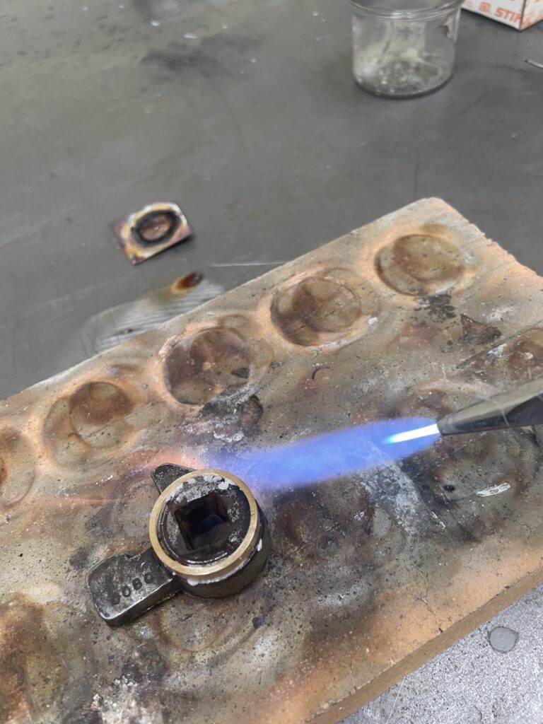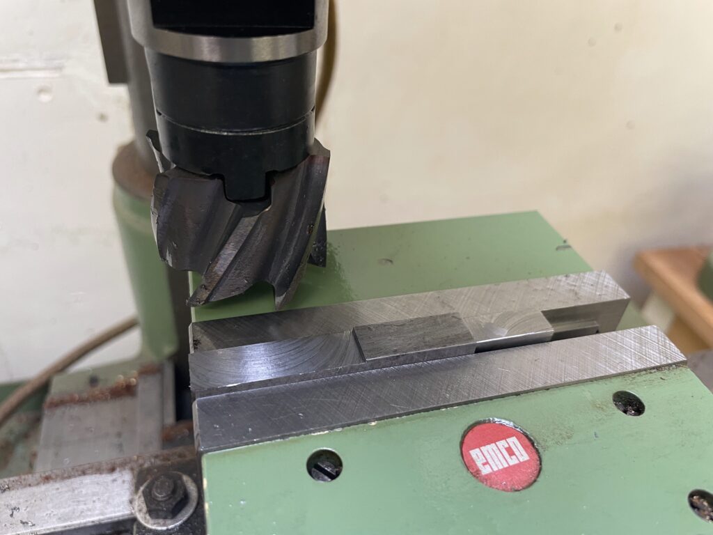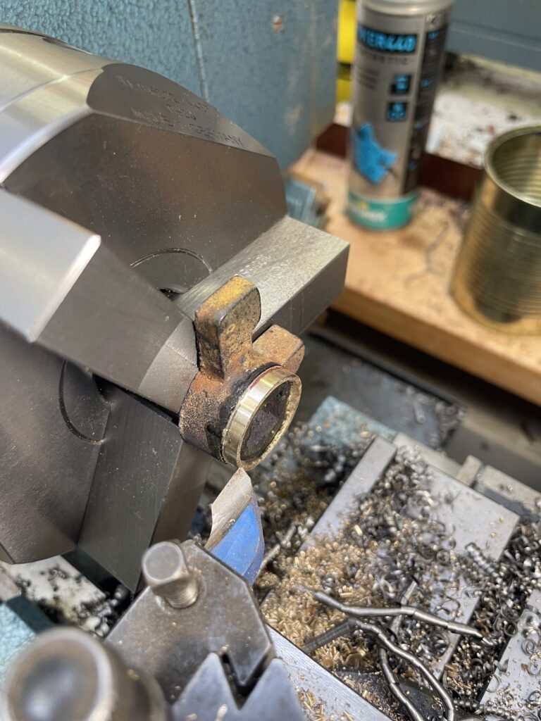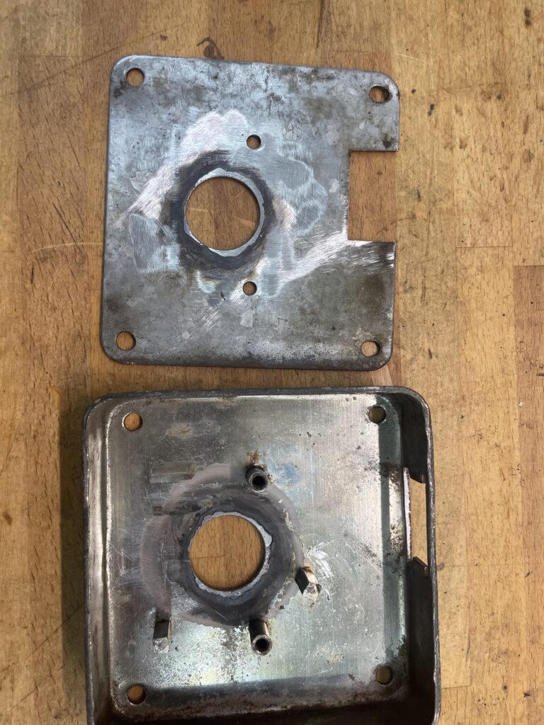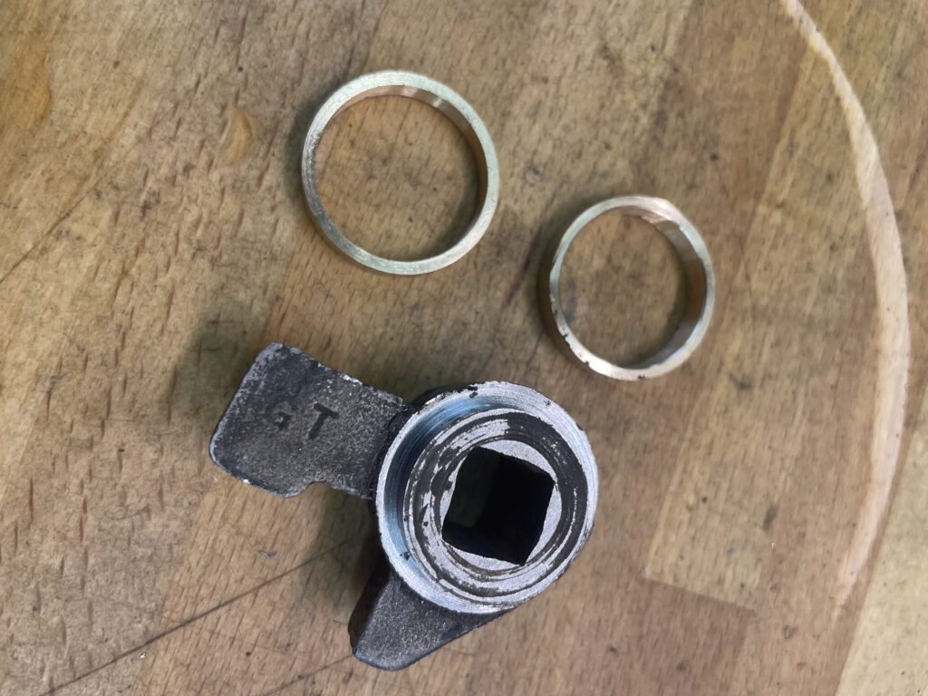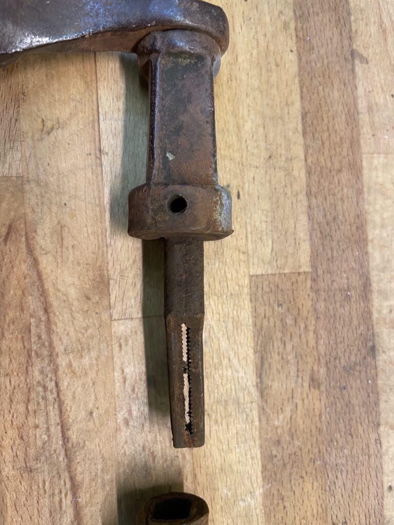 Türdrücker hing durch, Schloss und Drücker ausgeleiert, Schlosskasten aufgeschweisst und bearbeitet, Nuss bearbeitet und aufgebüchst, Drückerdorn hergestellt, Schloss gereinigt und schwarz lackiert.
